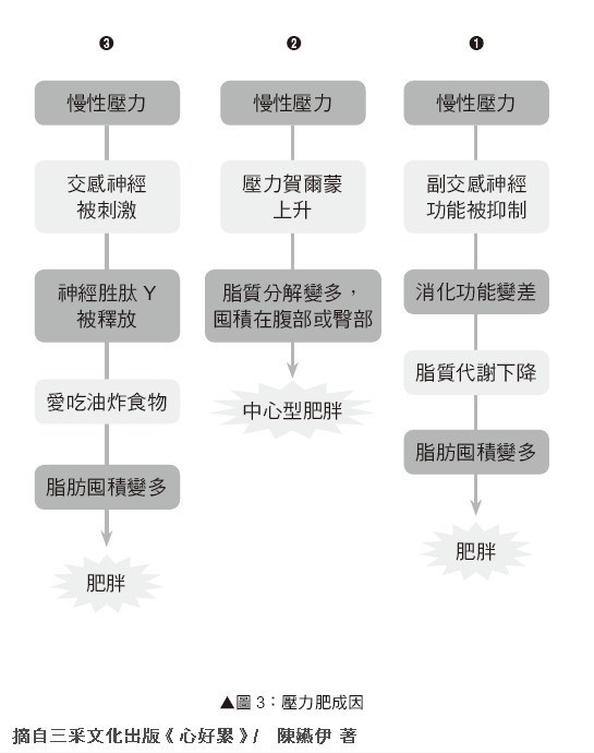 其次,原本吃完食物之後應該要運動代謝掉,偏偏碰到壓力來時卻不愛運動,熱量無法消耗,於是堆積在體內,自然形成肥胖
