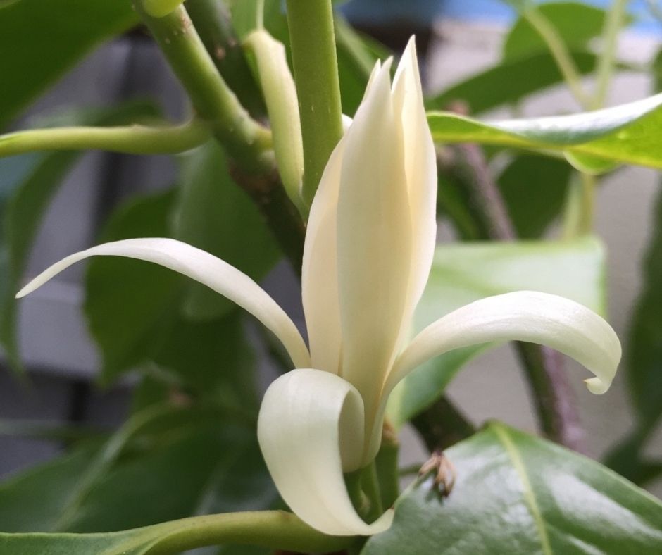白玉蘭香氣帶有些許奶香、莓果香與花香,是街頭停等紅燈時,頭戴斗笠全包覆頭罩、面罩提著吊籃穿梭在車潮壅擠的大馬路上,販售的成串白色長柱型玉蘭花,搖下車窗將買來的花朵掛在車上,清幽的香氣,頓時滿車芳香,將開車所需要的專注力與緊繃感,慢慢透過消融排解