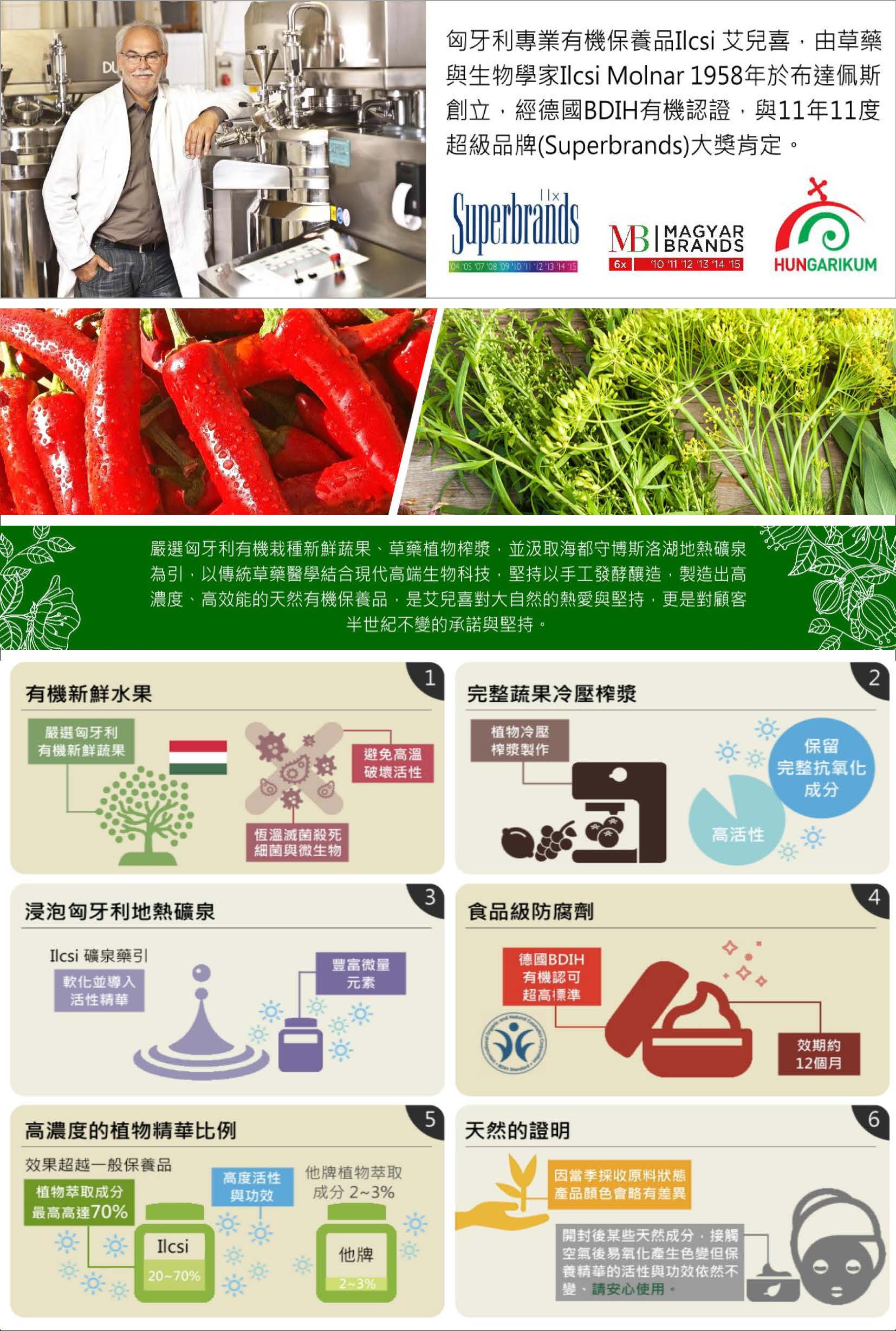 秉持著自然(Nature)、 健康(Health) 與美麗(Beauty)的信念,艾兒喜以純正的歐洲草藥學配方為主軸,嚴選匈牙利有機栽種、純淨無污染的新鮮水果、草藥植物,並汲取全世界獨一無二的海都守博斯洛湖(Lake Hajduszoboszlo)地熱礦泉,全程以專利恆溫滅菌與家族秘傳的發酵萃取方式,手工限量精煉出含有完整植物果實、最純淨新鮮的高活性護膚品,再嚴格溫控空運行銷全世界,這是Ilcsi®艾兒喜對大自然的熱愛,更是對顧客半世紀不變的承諾與堅持。